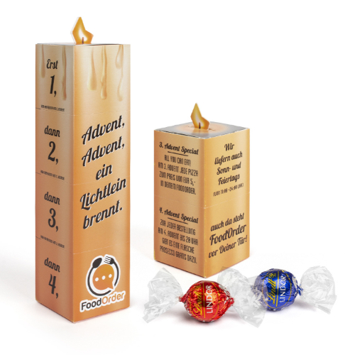 Die leckere Adventskerze: Individuelle Adventskartonage mit 4 Würfeln zum Abtrennen, die das Abbrennen einer Adventskerze symbolisiert. Die Würfel sind jeweils mit einer feinsten Lindt Lindor Kugel aus Milchschokolade oder Schokolade feinherb befüllt. Format ca. 41 x 172 x 41 mm.
