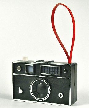 Bildbetrachter - Gucki - in der Form eines Fotoapparats, mit Schlaufe, für 8 Innenbilder, Format ca. 88 x 55 x 27 mm.