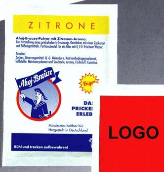 Original AHOJ-Brausepulver, Orange oder Zitone, in weissem Papier.