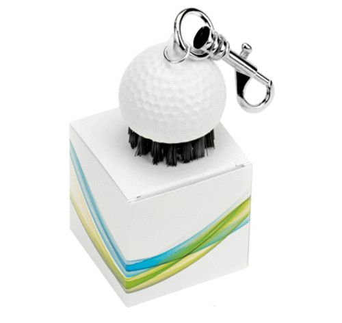Golfbürste in Form eines Golfballs, mit schwarzen Borsten und Karabiner, original Golfballgrö0e, auf Wunsch gegen Aufpreis auch im Geschenkkarton.