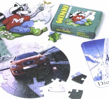 Individuell gestaltetes Werbepuzzle 175 x 125 mm in Werbe-Faltschachtel, Puzzle und Faltschachtel 4/0 bedruckt. Das Puzzle kann auch konturgestanzt geliefert werden. Puzzle sind auch in anderen Grössen oder als Rahmenpuzzle lieferbar.