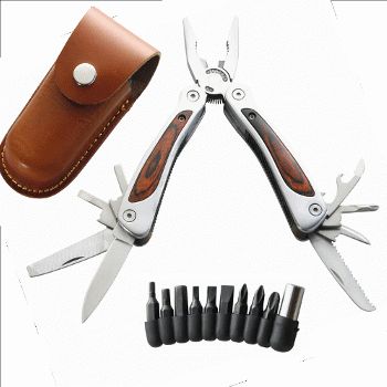 Robustes und vielseitiges Multitool vom Markenhersteller mit 8 Werkzeugen, wie Zange, Klinge, Schraubendreher, Vitadapter, Säge. Mit Gürteletui aus Leder.