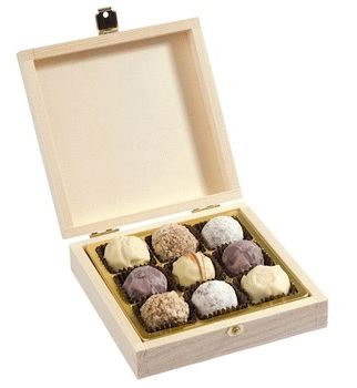 Holzkassette mit 9 feinen Stückchen Glück aus bester belgischer Schokolade.