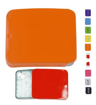Ca. 10 g Minzdragees in einer dekorativen Schiebedeckeldose aus Blech, Dose lieferbar in vielen Farben, Format ca. 54 x 45 x 11 mm.