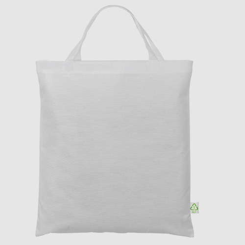 Umweltfreundliche Tragetasche, hergestellt aua recycelten PET Flaschen. Langlebig und robust, 2 kurze Henkel, weiß. Format ca. 38 x 42 cm.