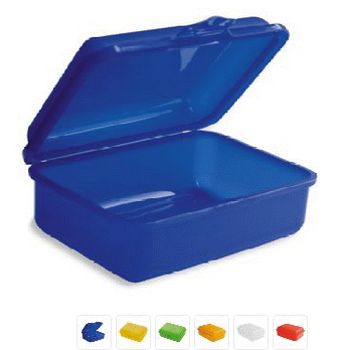 Vesperbox (Lunchbox) aus PP Kunststoff, Format ca. 18 x 13 x 7 cm, lieferbar in 7 gefrosteten Farben. Bei Grossauflagen ist auch eine InMould Veredlung möglich.