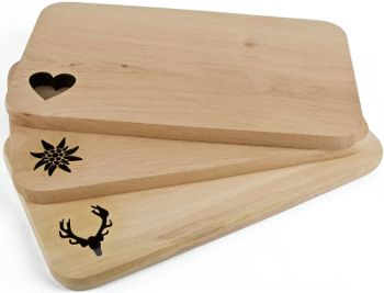 Brotzeitbrett aus massiver Erle, aussergewöhnlich durch gelasertes Motiv, z.B. Herz, Baum etc., auch Kundenmotive können gelasert werden. Format ca. 22 x 12 x 1,2 cm.