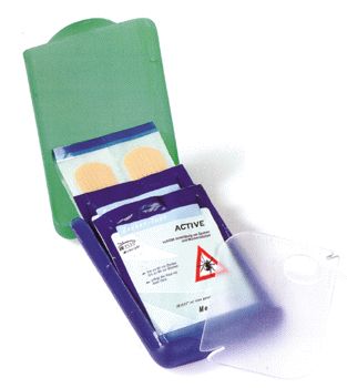 Schutz bei Zecken oder Mückenstichen : Kunststoffetui bestückt mit 5 Pflaster-Strips, 2 Zeckenschutz-Tücher und 1 Zeckenkarte. Format des Etuis ca. 100 x 70 x 15 mm, Etui lieferbar in mehreren Farben.